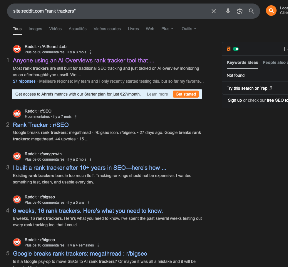 Search Reddit for your target keywords and identify questions without satisfactory answers. These content gaps are your opportunities. Track where competitors are mentioned, noting context and sentiment.